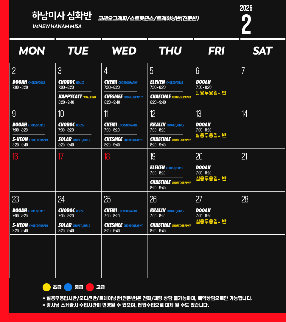 * 위 내용에 안내되어 있는 클래스만 등록/결제 가능하고, 입시/오디션/개인레슨은 상담 후 등록/결제 가능하신 점 양해부탁드립니다